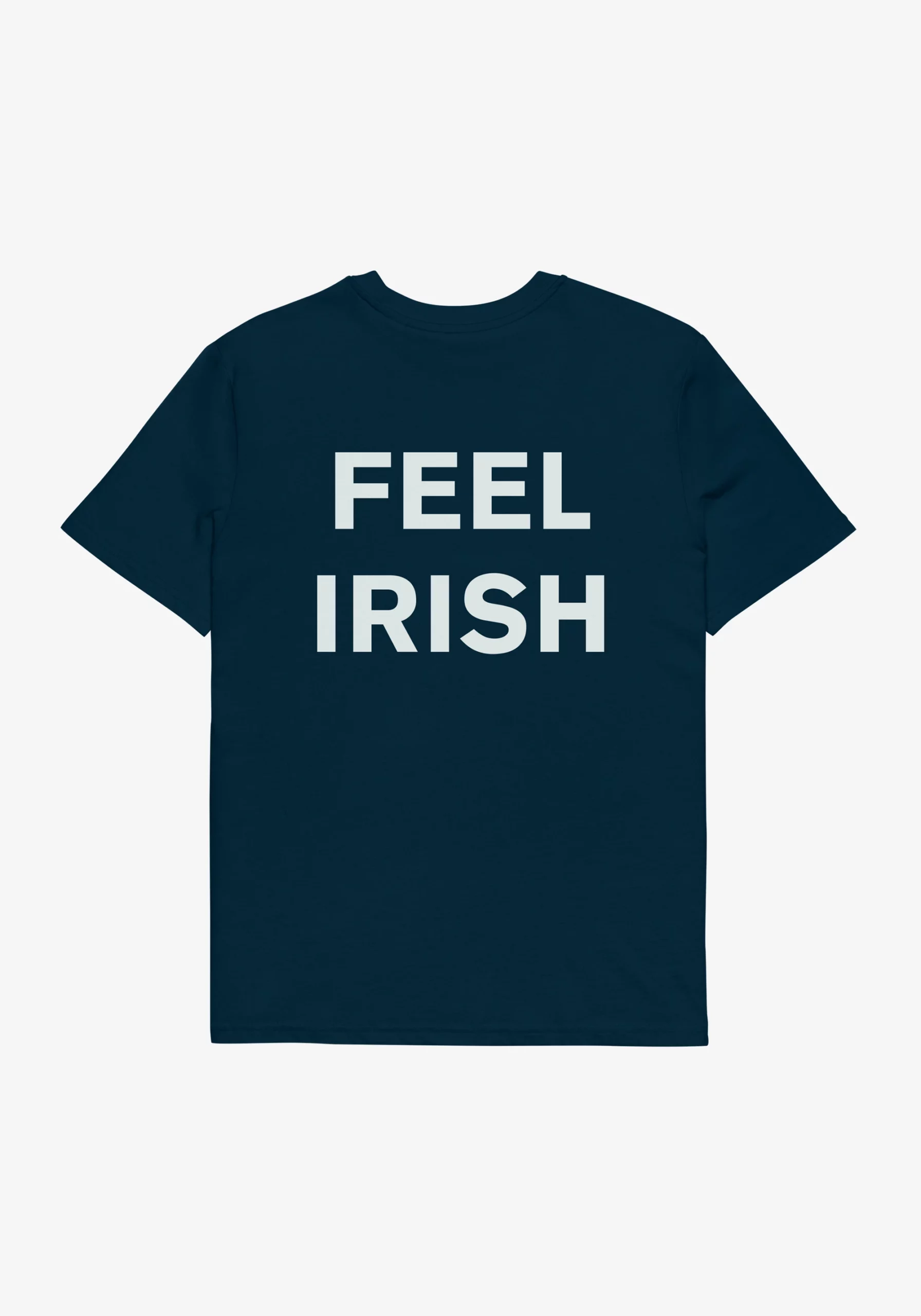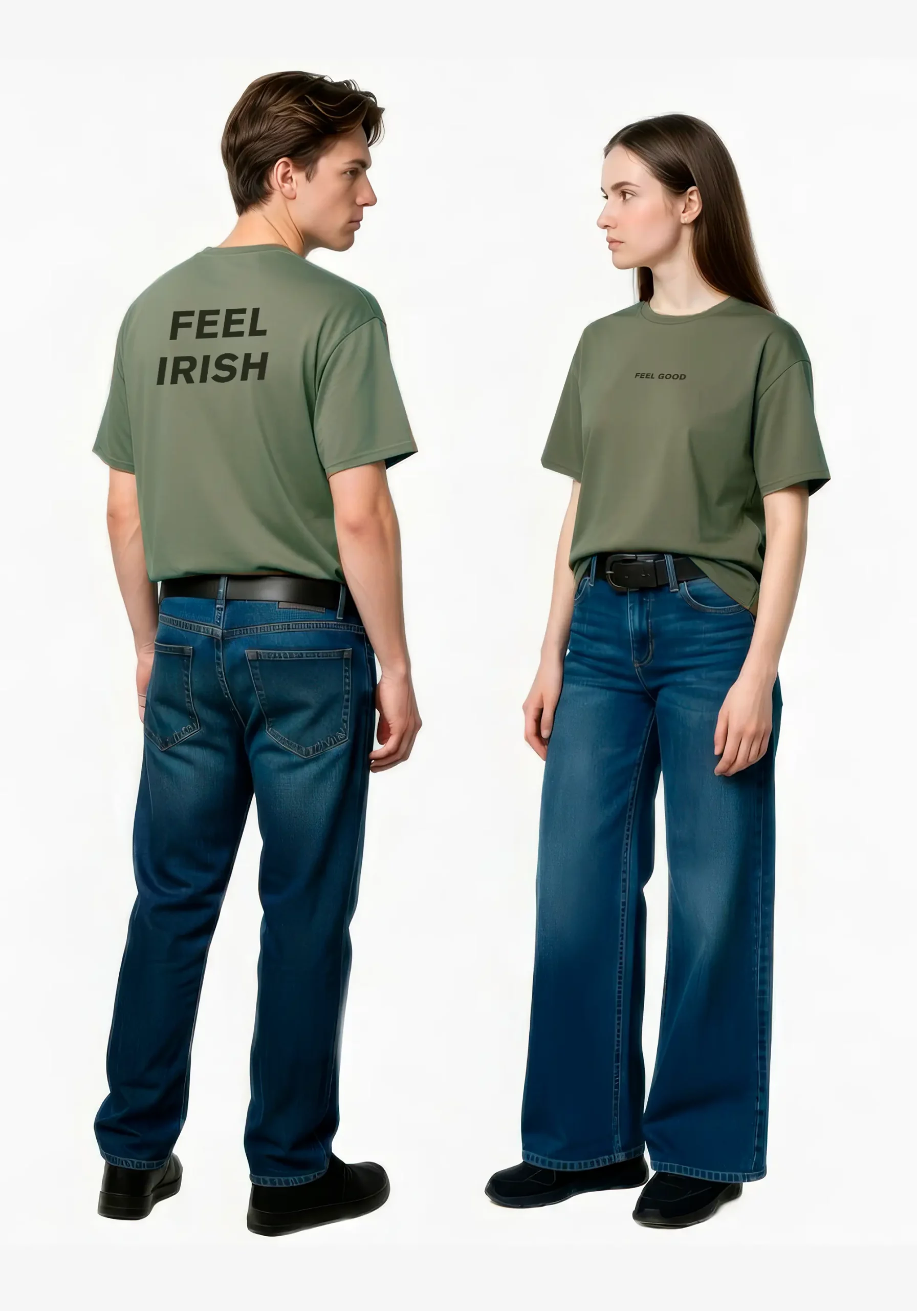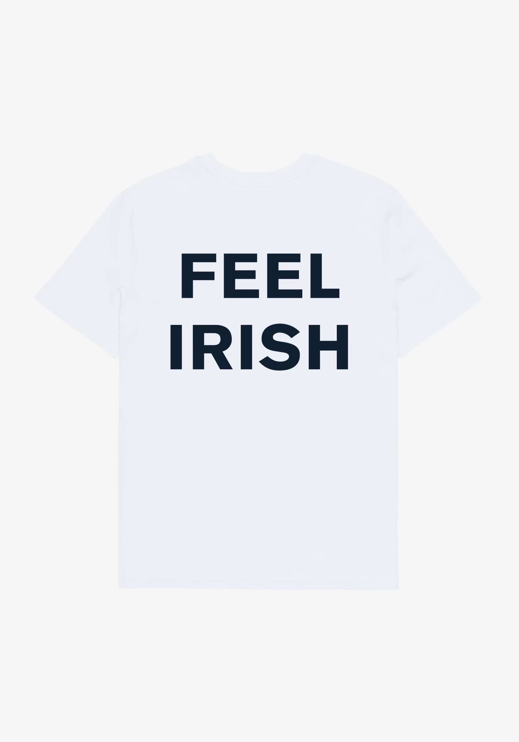 Front print reading Feel Good and large back typography reading Feel Irish.