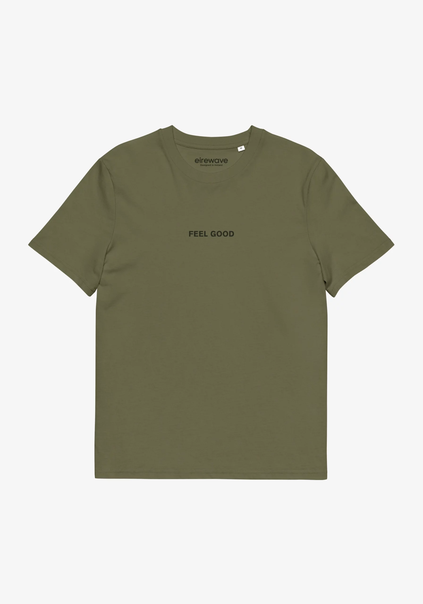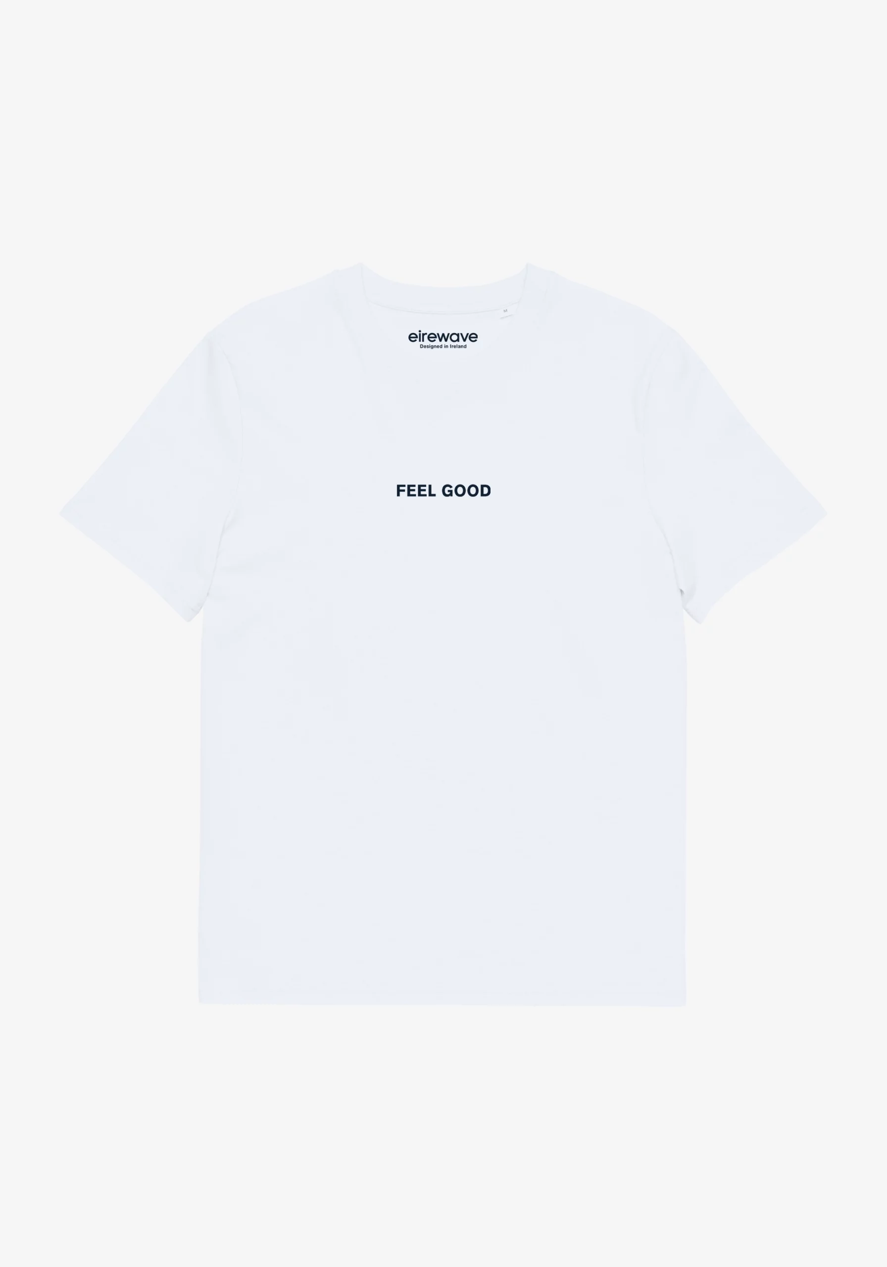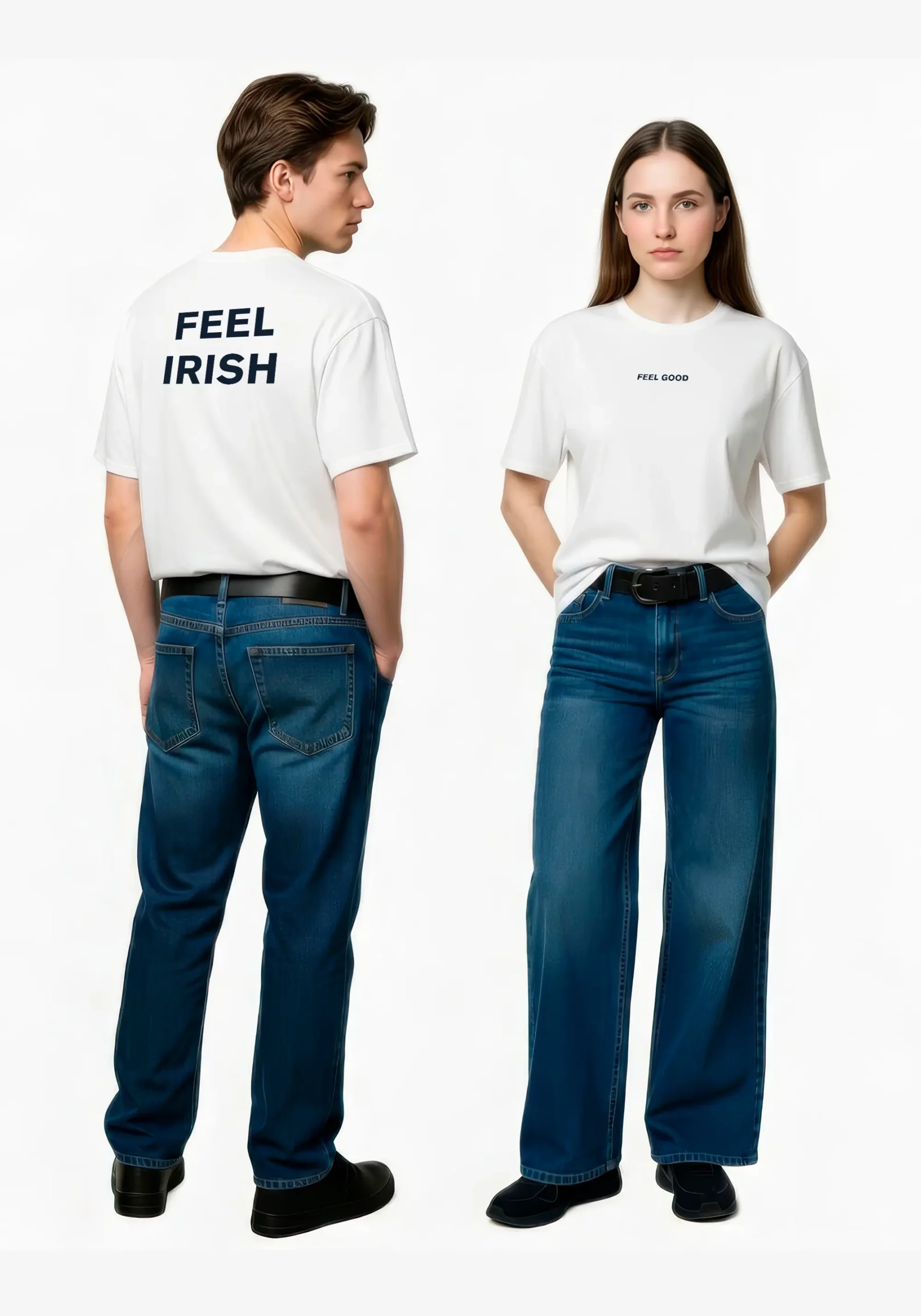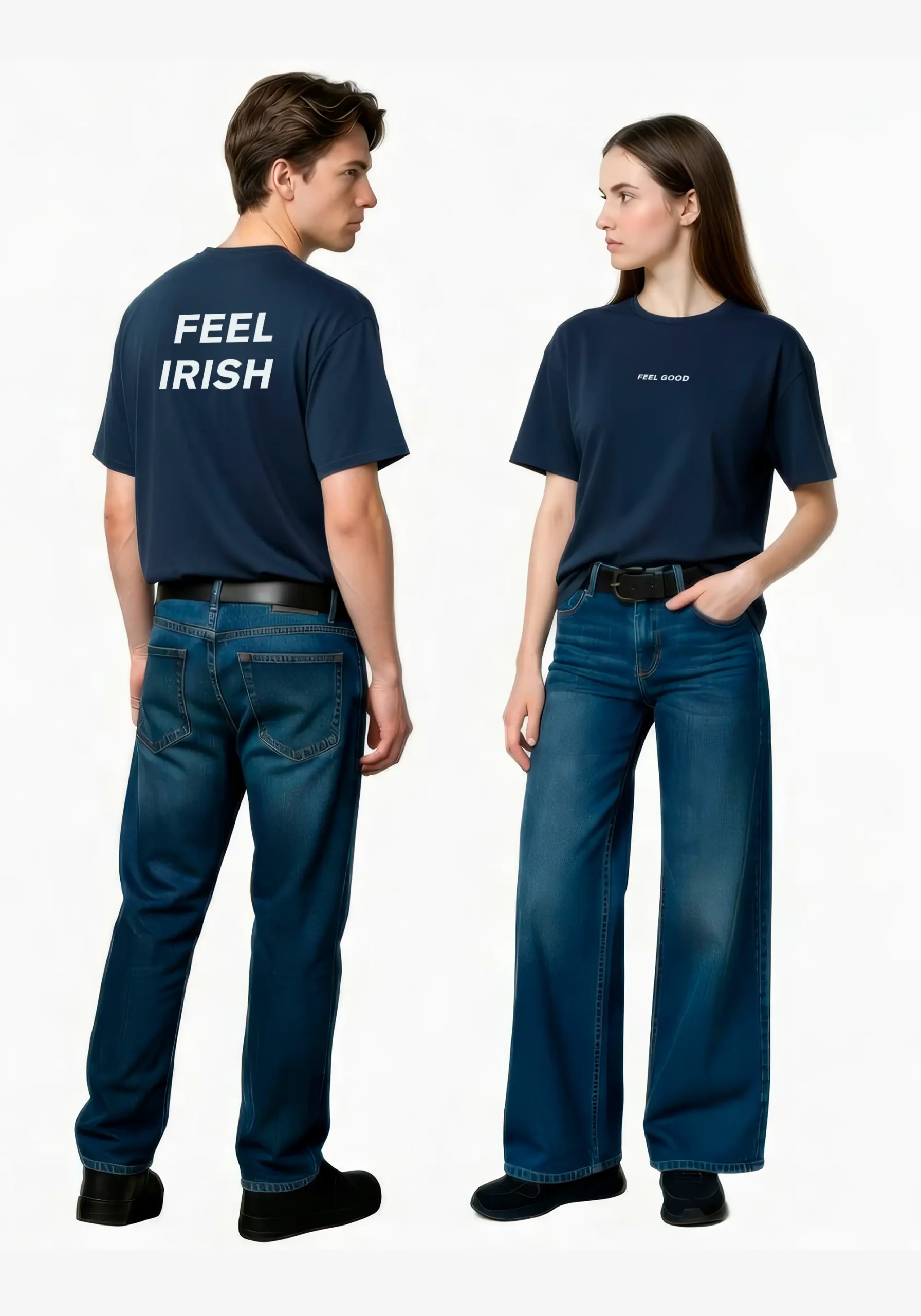 Front print reading Feel Good and large back typography reading Feel Irish.