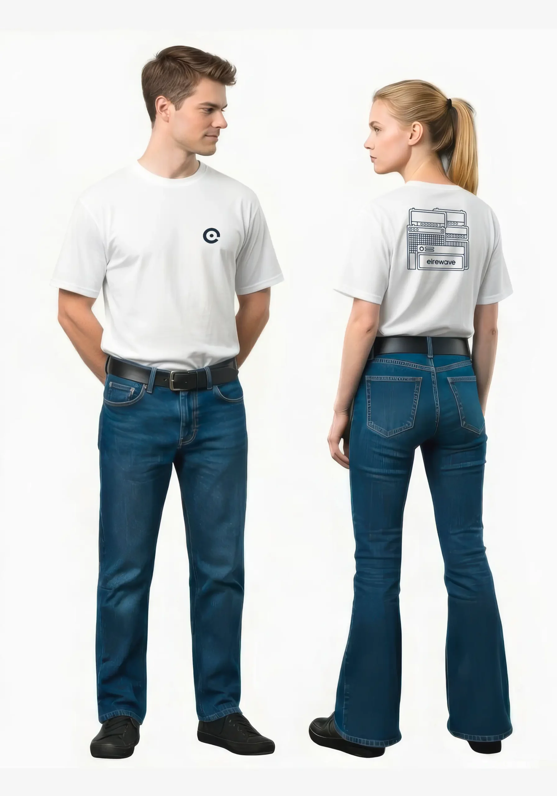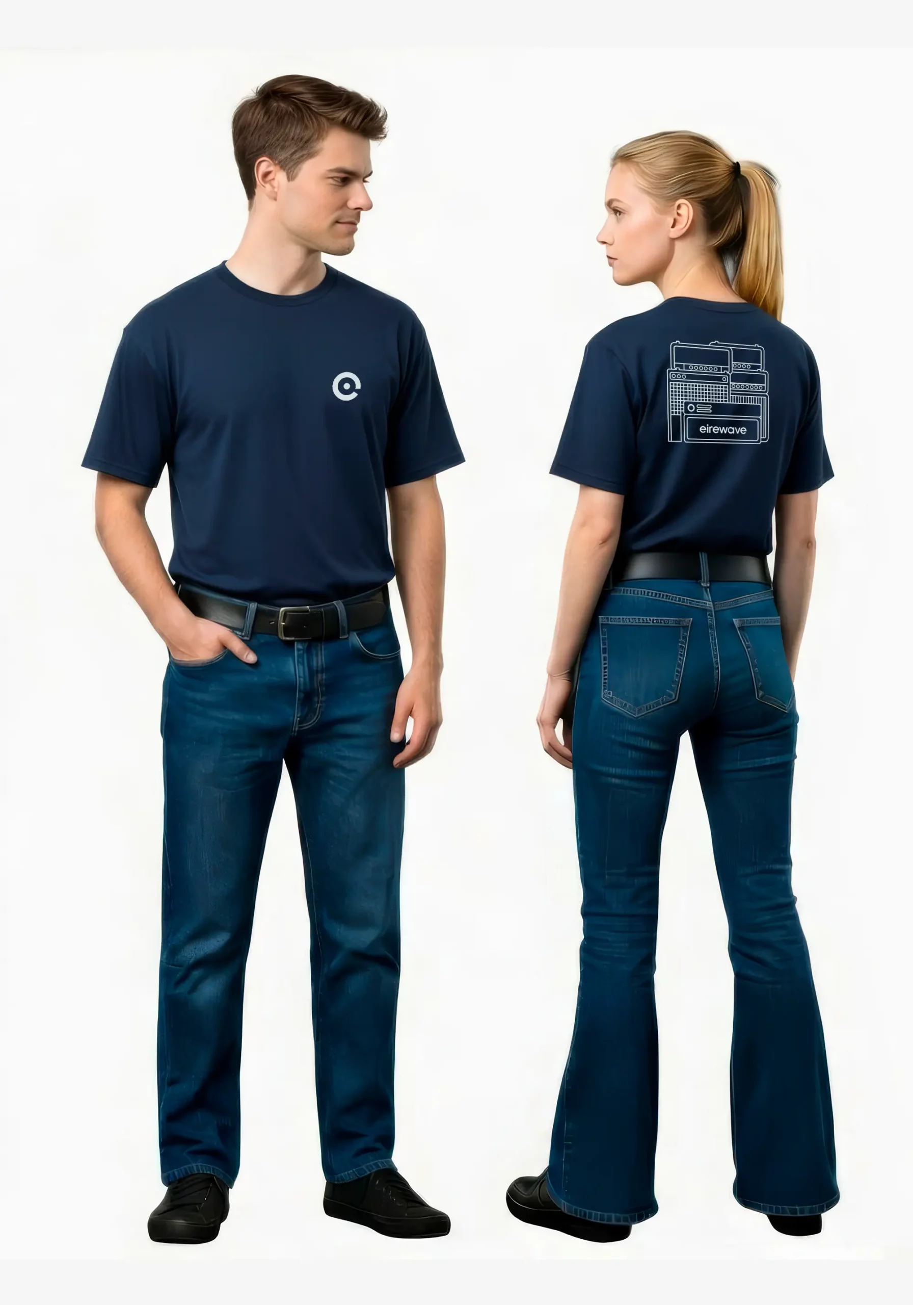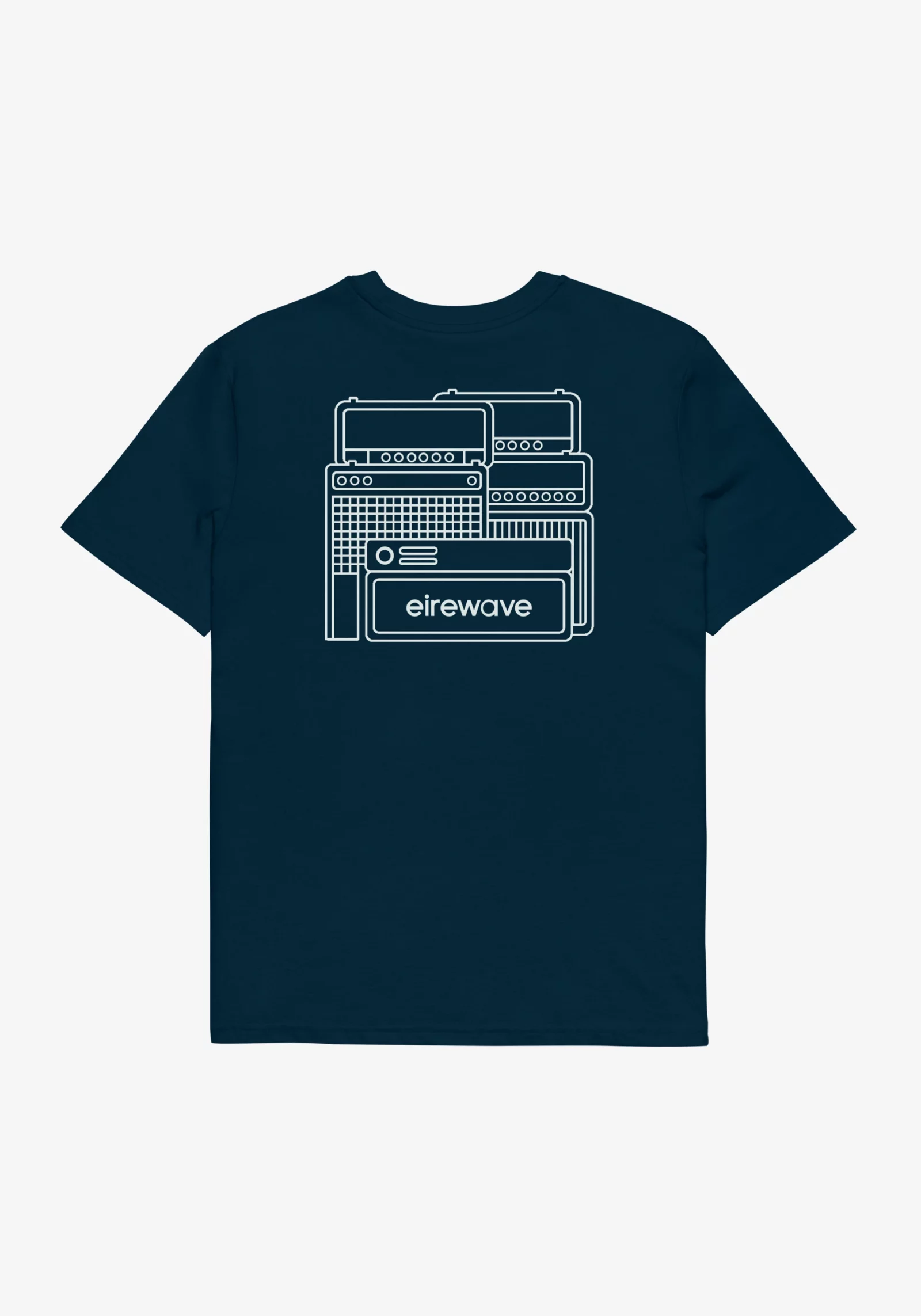 Printing of a stacked guitar amplifier line-art on the back and Eirewave monogram on the chest.