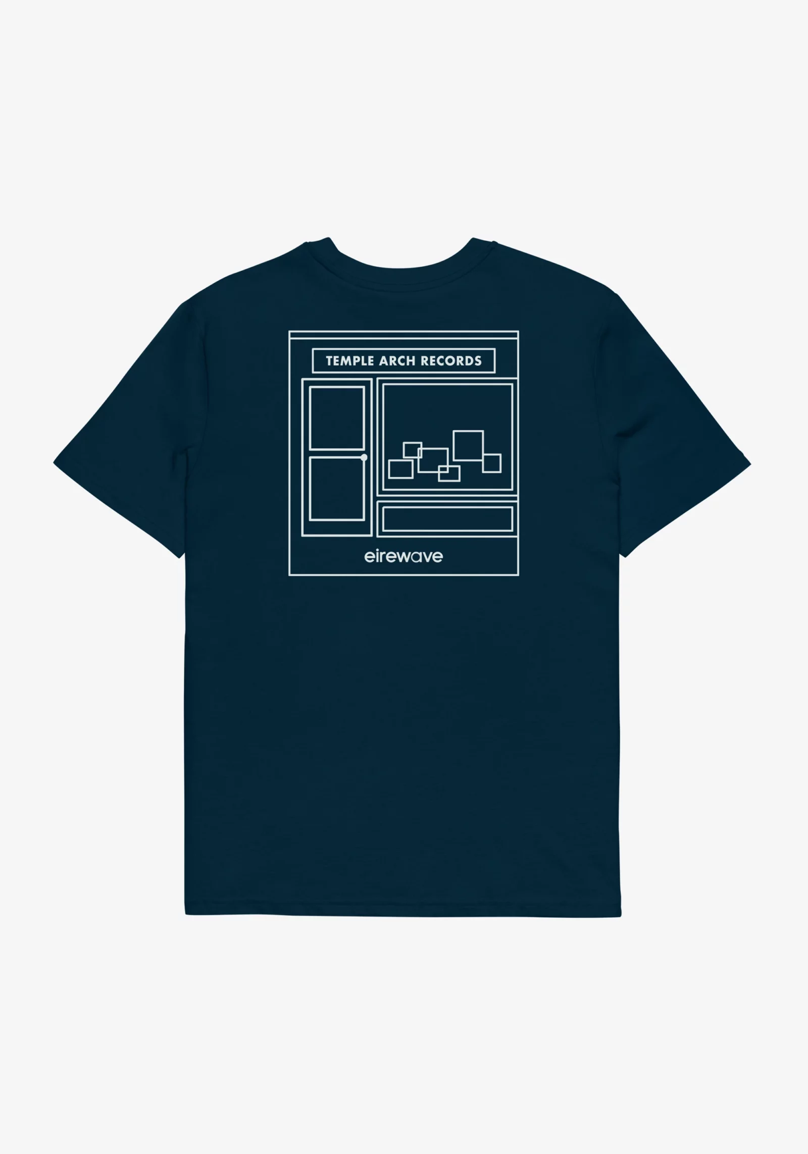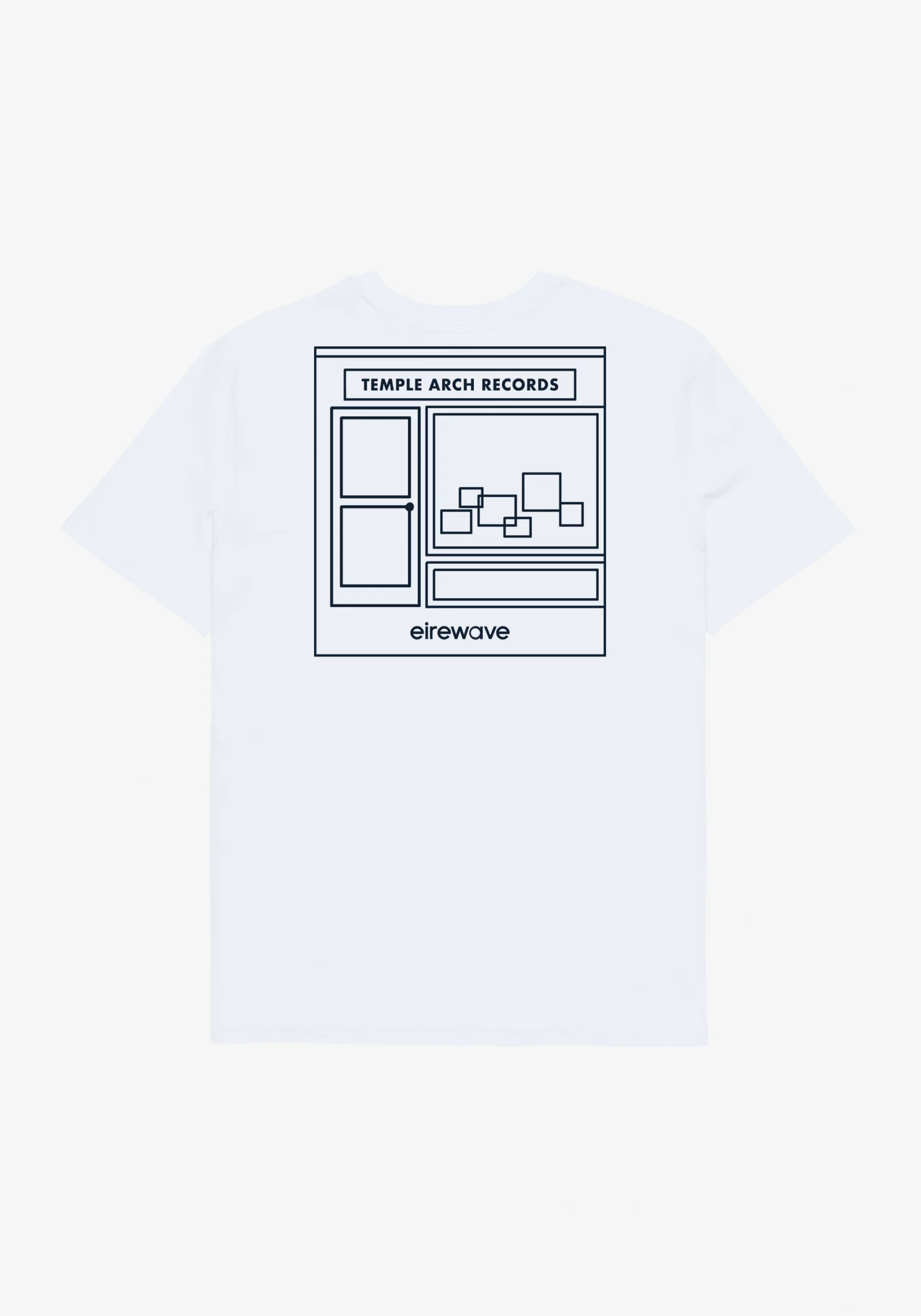 Printing of the Temple Arch Records storefront line-art on the back and Eirewave monogram on the chest.