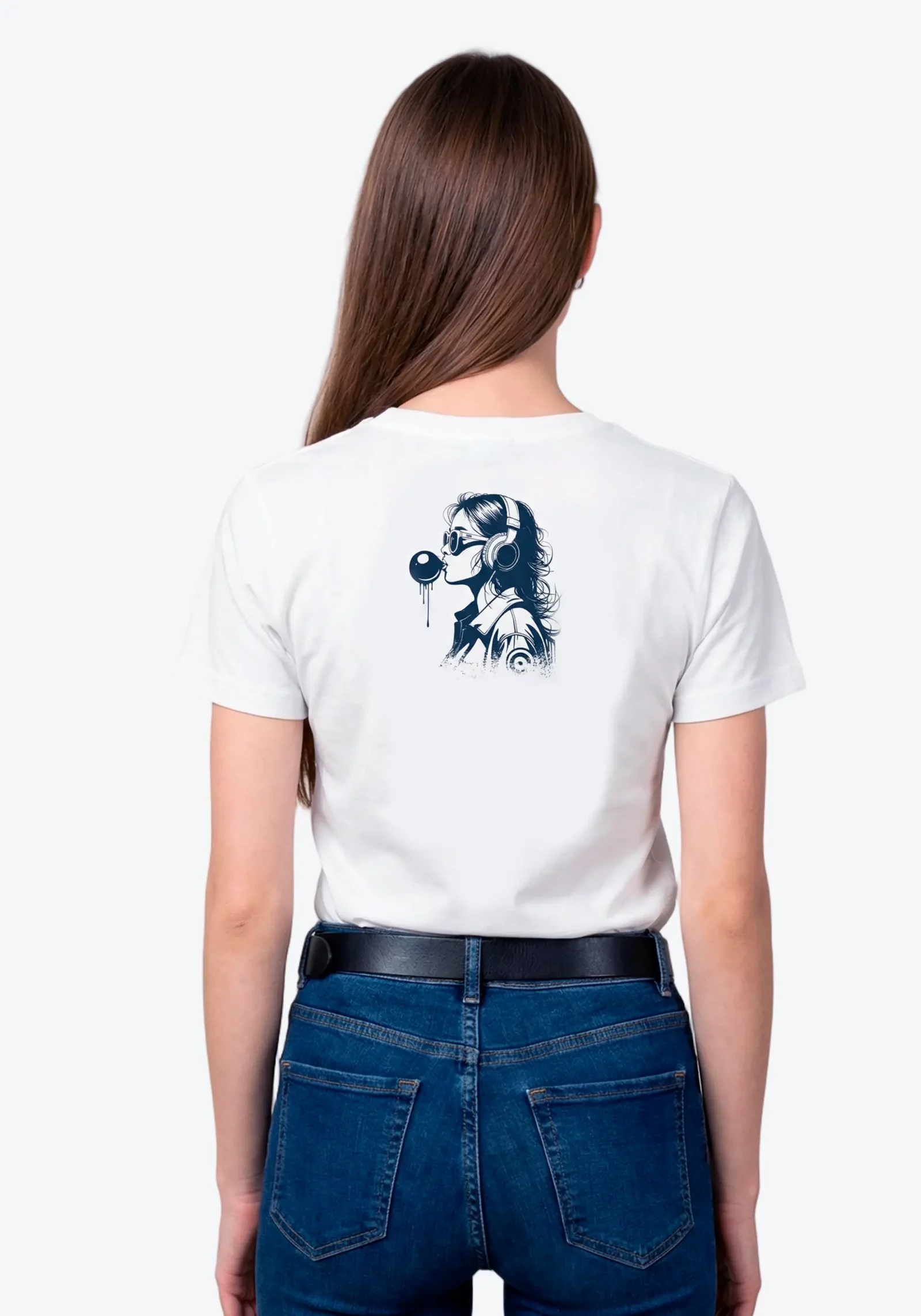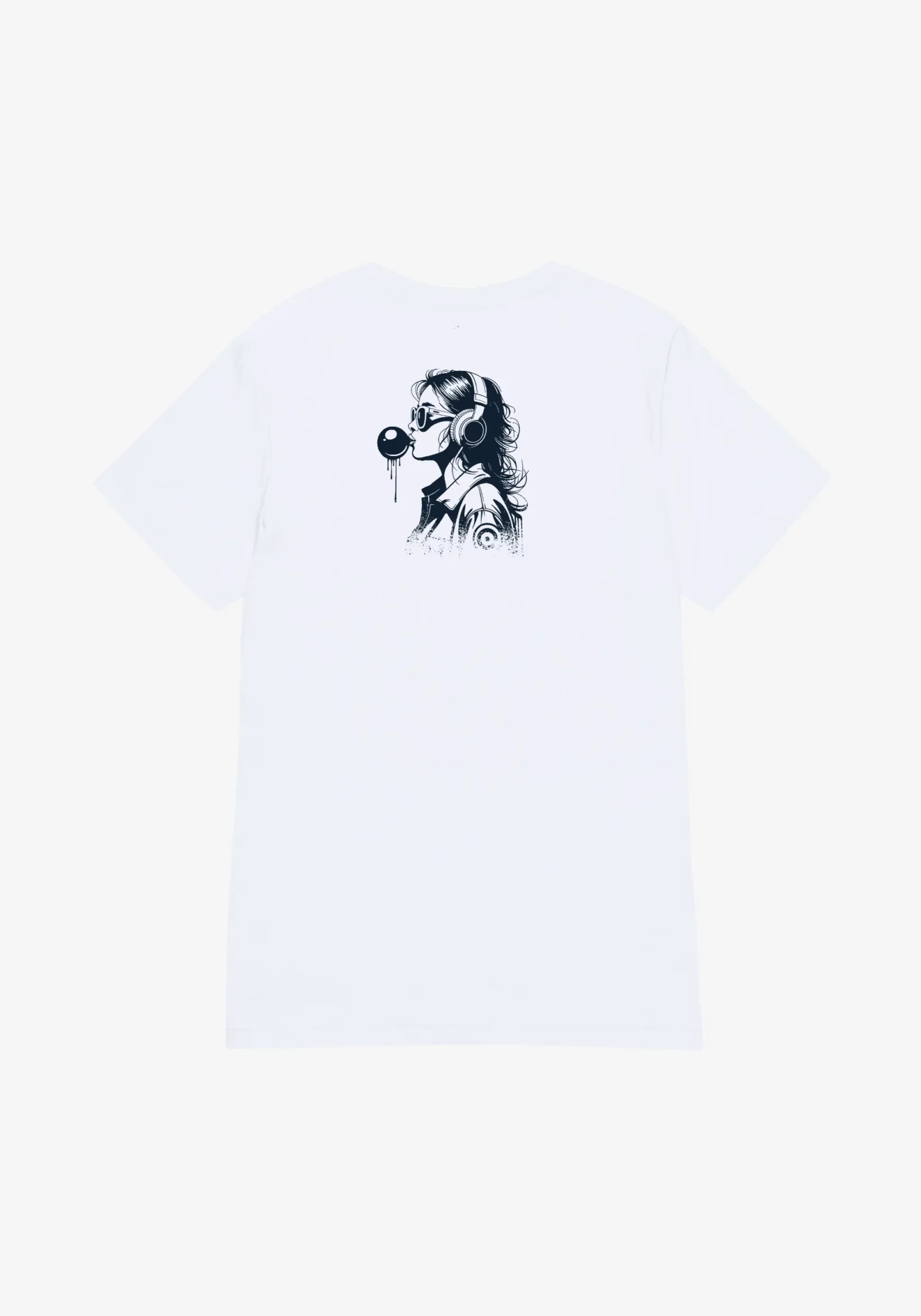White T-shirt featuring an illustration of a girl blowing a bubblegum bubble while wearing headphones on the back, with the Eirewave monogram on the chest.