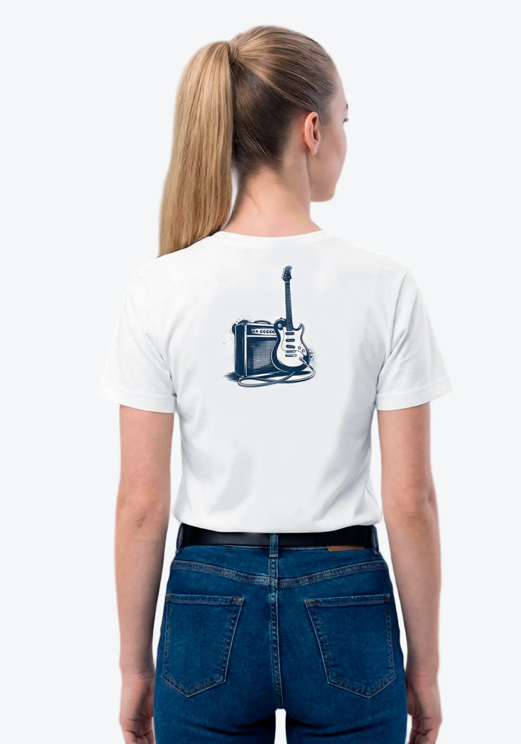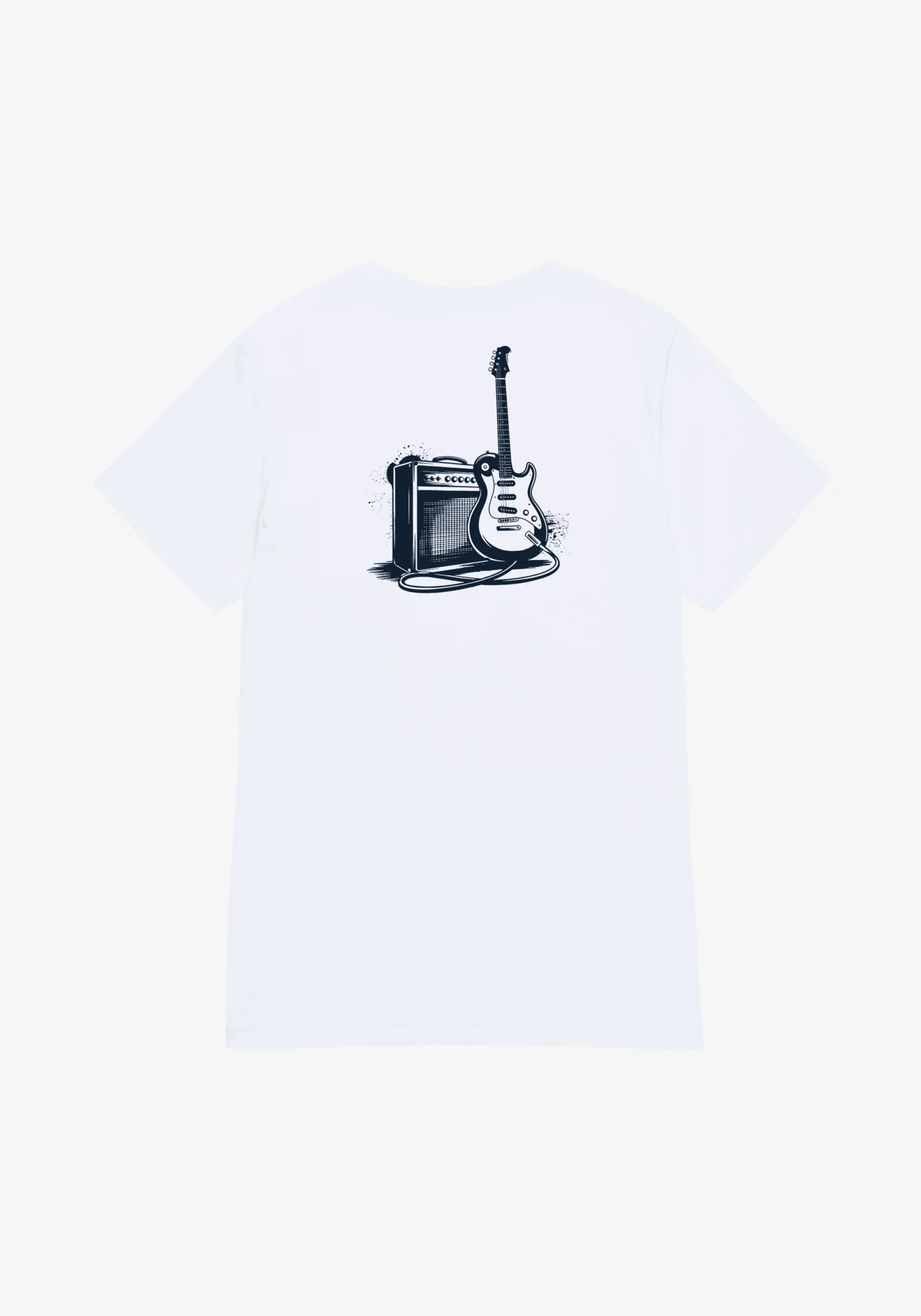 White T-shirt featuring a guitar amplifier illustration on the back, with the Eirewave monogram on the chest.